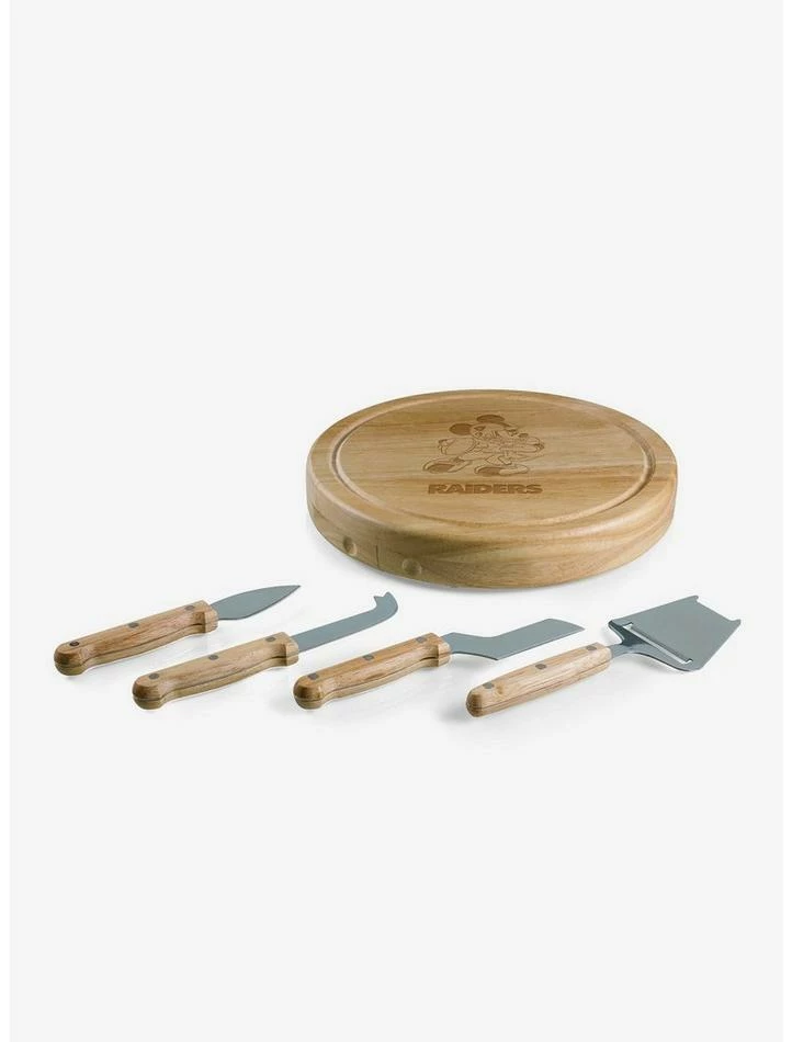 The Mickey Las Vegas Raiders Circo Cheese Board & Knife Set makes brilliant and attractive use of limited space with a split-level wood charcuterie board and interior cheese set. What makes it such a Disney-meets-NFL MVP? Made from eco-friendly parawood, this cheese board’s cutting surface swivels open to reveal contains four brushed stainless steel cheese tools including: one cheese cleaver (for crumbly cheeses), one cheese planer (for semi-hard to hard cheese slices), one fork-tipped cheese knife, and one hard cheese knife spreader. This wood cutting board also features a recessed juice groove to catch cheese brine or juice from cut fruit. Whether you’re entertaining at home or taking it on the road as a picnic cheese board set, you can show off your NFL fandom and Disney devotion with this unique conversation piece.