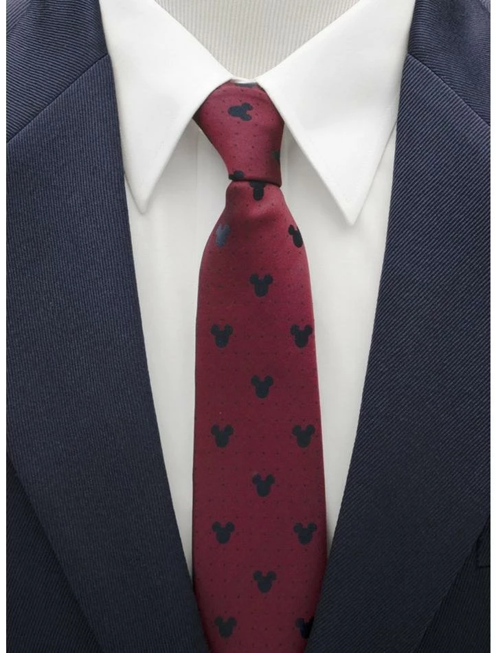 The deep red of this Disney tie will pair beautifully with your best suit, and features the Mickey Mouse silhouette in a menswear inspired pin dot pattern. The 3″ width complements the modern trends without being too skinny for the more conservative man. Add a little Disney magic to your holiday wardrobe with the 100% silk. Mickey Mouse Red Pin Dot Tie. Approximately 59″ x 3″, 100% silk. Officially licensed by Disney.